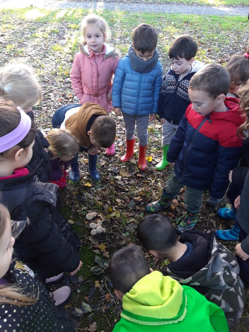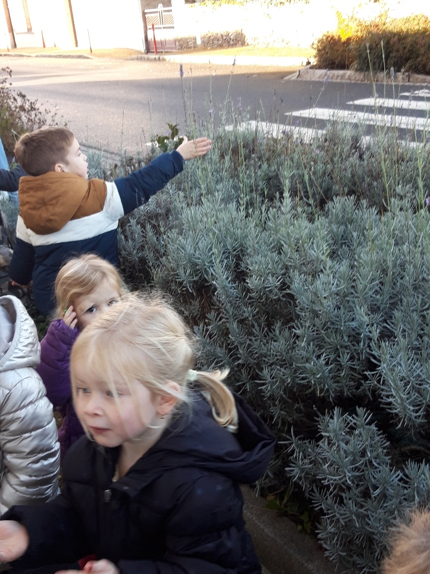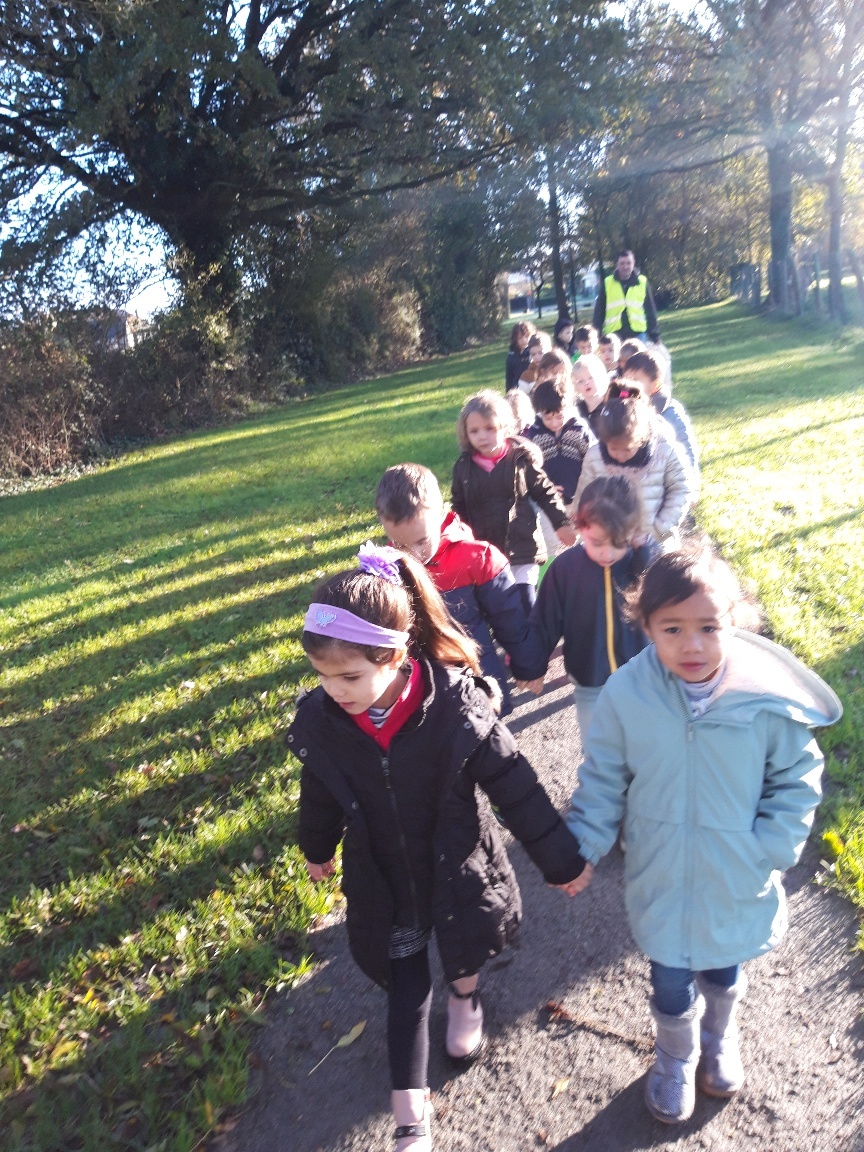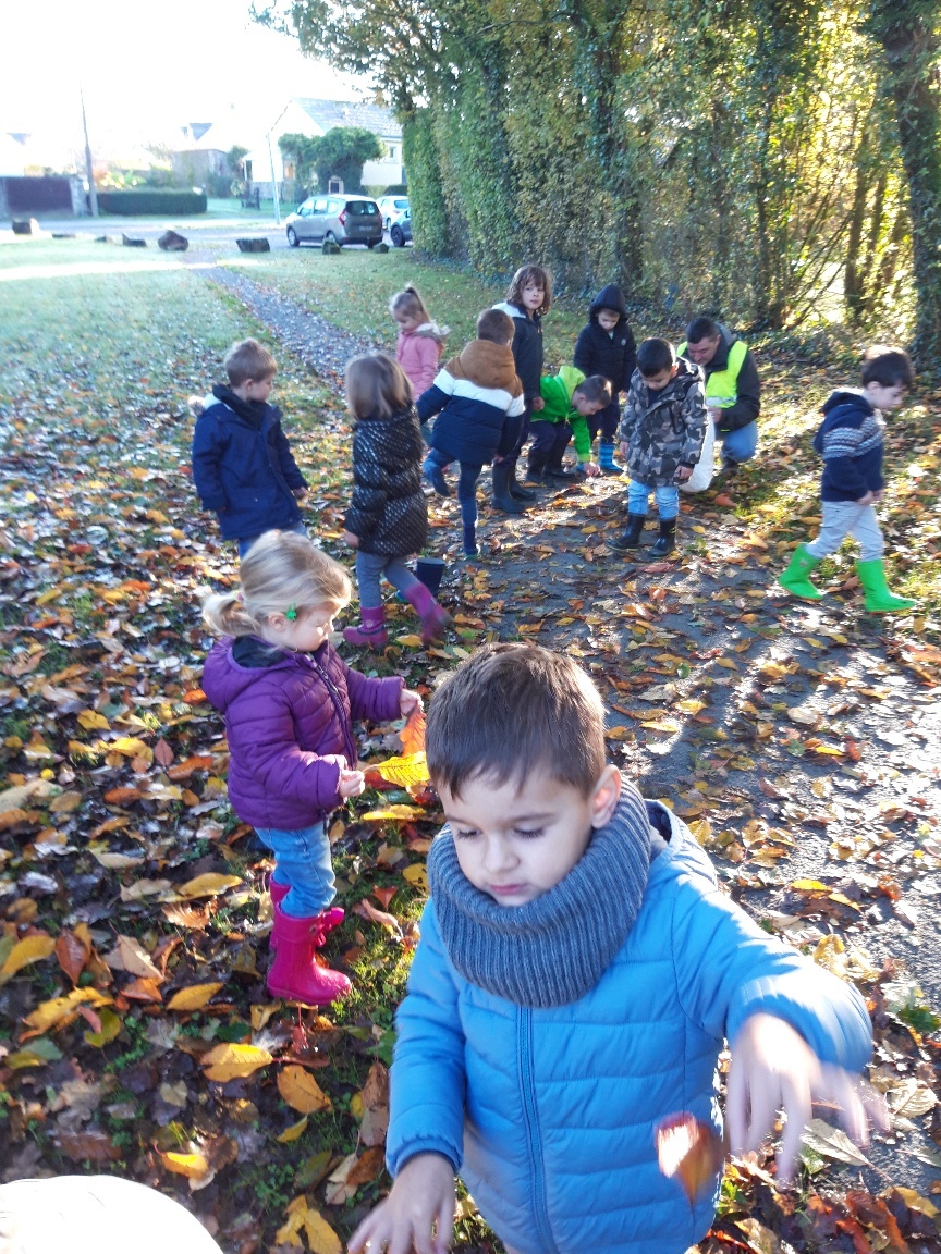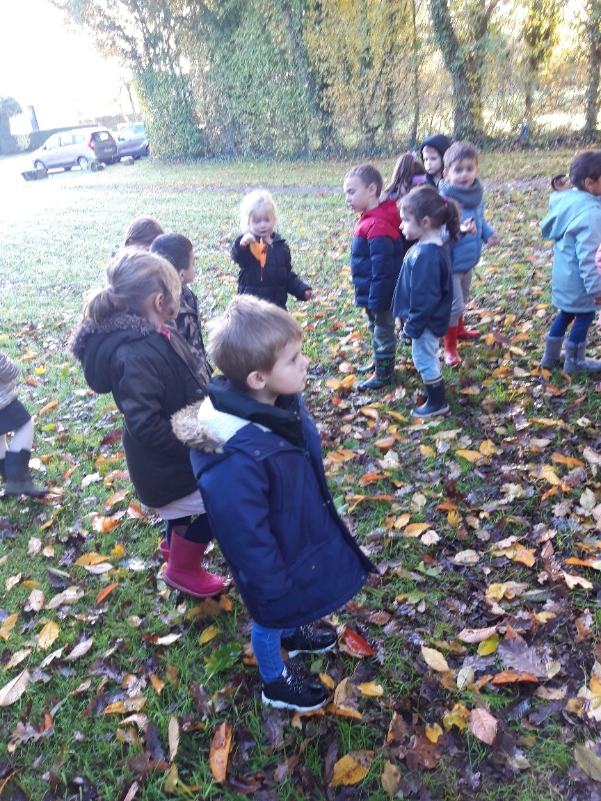 Vendredi 18 novembre les enfants de la classe de PS MS GS sont allés faire une promenade pour observer la nature en automne et faire une collecte de feuilles, de fruits et branches. Les enfants ont observé des arbres avec plus ou moins de feuilles, des nids, des champignons, des cabanes pour les mésanges, des taupinières, de la lavande, du bambou, les boites aux lettres (même celle du Père Noël!)…